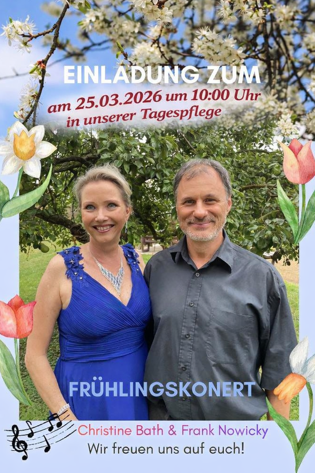 Die Sopranistin Christine Bath, am Klavier begleitet von Frank Nowicky, führt mit ihrer kraftvollen Stimme und erfrischenden Ausstrahlung durch ein buntes, musikalisches Frühlingsprogramm.